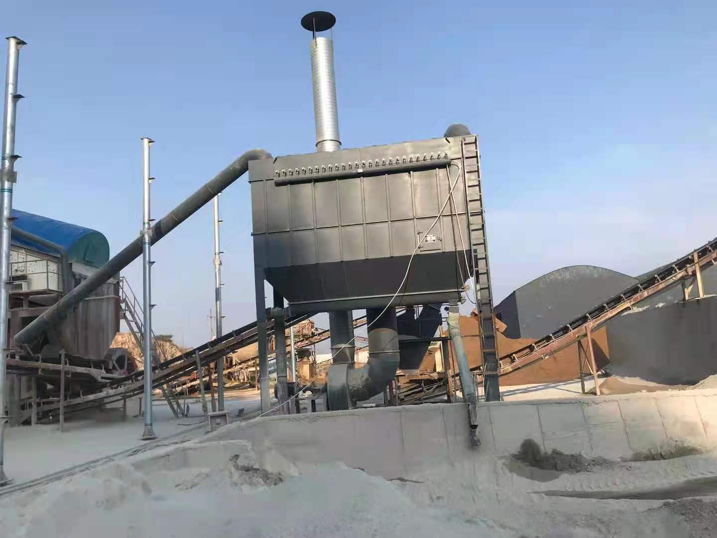 选矿场除尘设备底部安装螺旋输送机及卸料时具有锁风功能的星型卸料器,将收集在除尘器中的粉尘汇集到一处,便于回收利用。