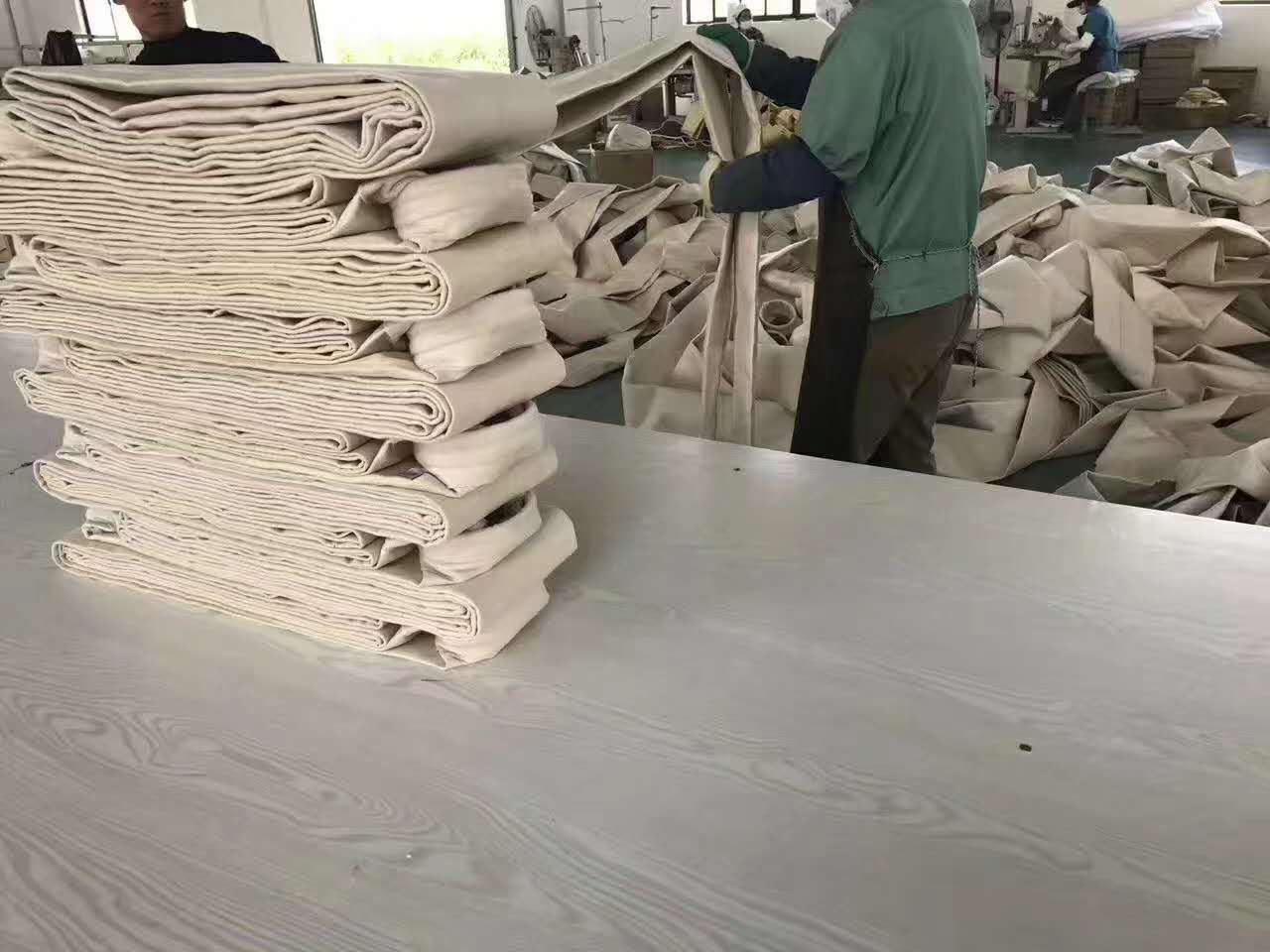 此外还有一些功效型除尘布袋,除尘布袋:在袋式除尘,如粉尘需要用除尘布袋来收集,则要求这种除尘布袋本身具有功能,生产抗静滤料除了具备生产普通针刺毡滤料设备外,还要求在生产针刺毡滤料的基布经纱中并入导电纤维纱或针刺毡纤维中间加入导电基布来实现功能除尘布袋导静电的特性;ptfe覆膜除尘布袋就是在针刺过滤毡滤料表面覆上一层ptfe微孔薄膜,针刺过滤毡滤料根据实际袋式除尘器设计透气量、排放浓度不同选择不同规格(厚度、孔隙率)薄膜经过滤料覆膜机一次热熔贴合成型;除尘布袋运用国内的滤料后整理设备,产品经烧毛、轧光、浸渍、涂层、烘干、定型等工艺处理,后处理水平,除尘布袋经处理后制成的过滤除尘布袋应用在含湿量较大的场合。