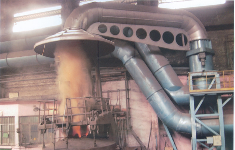 在离中频炉口1600至2000mm高的位置安装伞形吸尘罩,安装排气支管道,在支管道上安装调节阀和旋转走动装置,使伞形吸尘罩可以移动,可以吸两个炉体的烟气。烟气经支管道引入主通风管道,到火花捕集器去除掉火花,防止火花进入除尘器烧损除尘布袋,同时火花捕集器也是初级除尘器,可以将其他回收价值不高的粉尘去除,然后利用布袋除尘器进行净化处理,由风机将烟气送烟囱排放。
