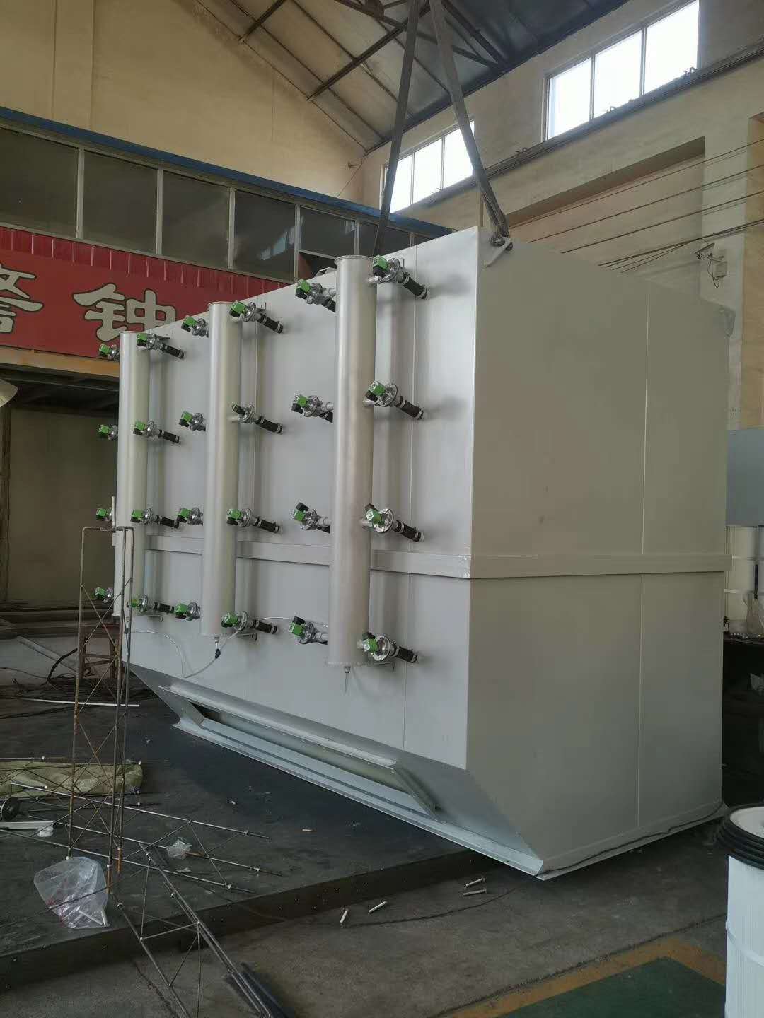 3、滤筒式除尘器的结构是由进风管、排风管、箱体、灰斗、清灰装置、导流装置、气流分流分布板、滤筒及电控装置组成,类似气箱脉冲袋除尘结构。