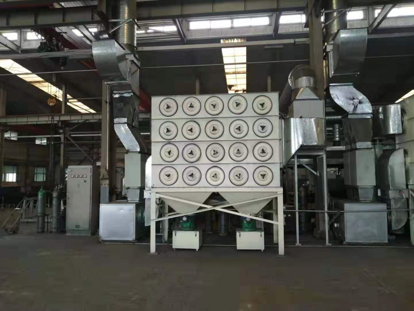 我公司的滤筒除尘器结构是由进风管、排风管、箱体、灰斗、清灰装置、导流装置、气流分流分布板、滤筒及电控装置组成,类似脉冲布袋除尘器的结构。