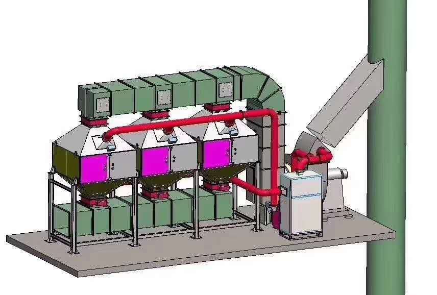 设备主要由干式过滤、活性炭吸附床、催化燃烧脱附床、配套风机、电器控制等组成。催化(DOC)净化装置其主要有两点作用,一是利用自身加热系统对活性炭进行加热,使活性炭内部的溶剂得以挥发出来,使活性炭得以重复使用,降低换活性碳后期使用成本。二是将脱附出来的废气进入催化室通过催化剂和加热作用, 净化废气,并生成二氧化碳为水蒸汽排入大气,为无二次污染,使用的设备。