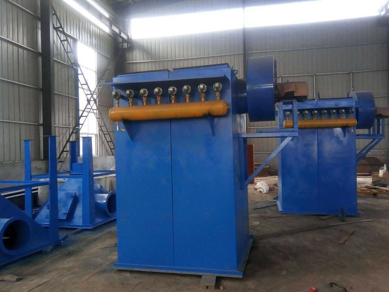 由进风口、过滤室(滤袋、滤袋框架)、清洁室(脉冲喷吹装置)、出风口、风机、灰斗(气流分布装置)和螺旋输送机或叶轮卸料器、爬梯检修平台、护栏、电气控制等组成。进 口(上、下)、出口(上)方向位置,可据现场设计需要灵活选择。